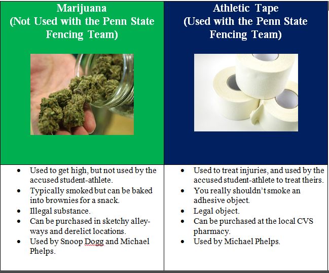 - Listen, Penn State, if you’re reading this, I have created a chart comparing athletic tape to marijuana. Please print out a copy for your shortsighted staff assistant so she won’t put any coaches in a quandary in the future, okay?