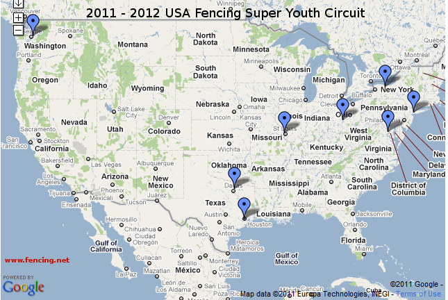 USA Fencing announced the winning bids for SYC (Super Youth Circuit) events for the 2011-2012 season. The announcement has already started a discussion on the Forums about the lack of an event in California.
