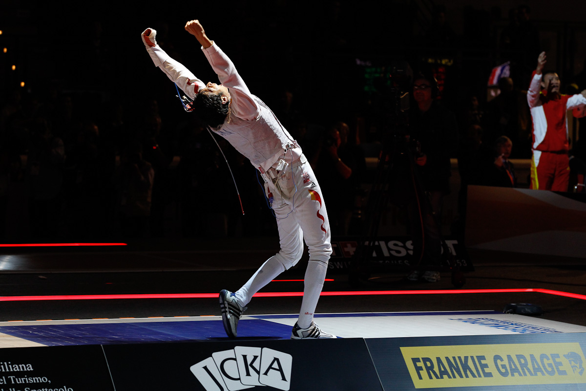 French closer Erwan Le Pechoux (FRA) faced off against Sheng Lei (CHN) and fought his way back into the match. Down 44-38 with only 90 seconds remaining in the match, Le Pechoux scratched back with an amazing run of touches to spark a French come-back. With only 8 seconds remaining in the match, Le Pechoux hit a remise to bring the match to 43-44.