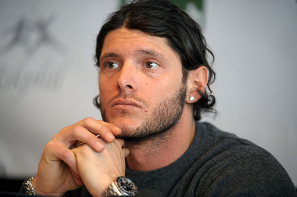 Italian fencing Olimpic Champion Aldo Montano attends the press conference unveiling him as new Virtus Scherma Fencing Team signing on February 9, 2012 in Bologna, Italy. Montano, like a number of European fencers, has been featured in product advertisements like this one.