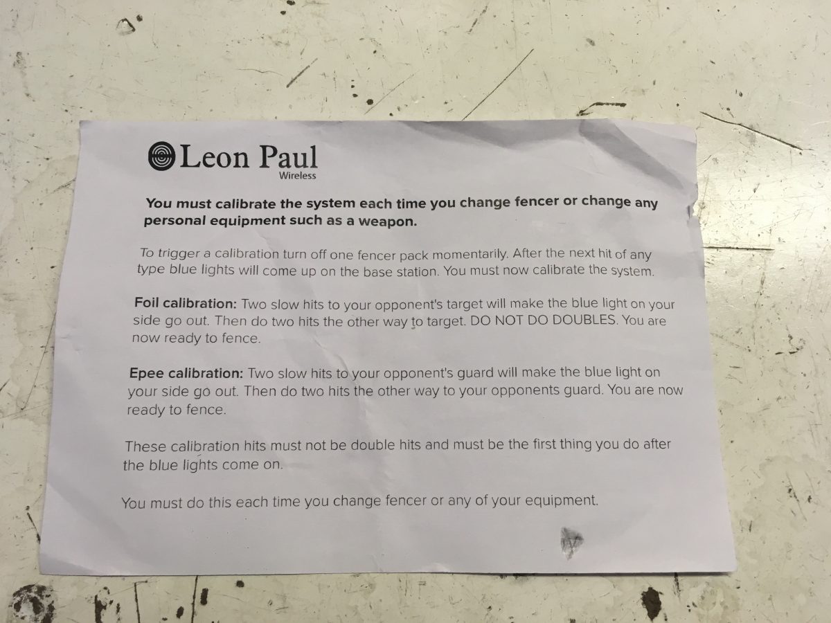 The second is the calibration. Fencers are used to the “test valid” process. The calibration process for the Wireless Fencing system is slightly different, but different enough to create potential issues. For both weapons, if you aren’t calibrated, a blue light will show up on the box and no touches can be scored. One fencer at a time must calibrate, and its generally not recommended to do anything other than calibration during calibration time. At all. Neither fencer should be leaning on a wall, sitting down, holding their weapon, etc.. Nothing that could throw off the calibration process.